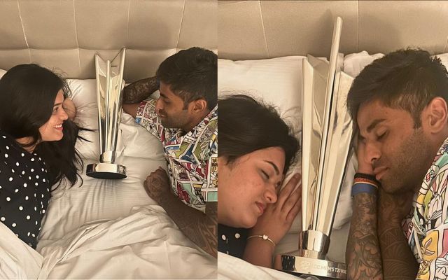 *दूसरी तस्वीर में Devisha और SKY ट्रॉफी को बीच में रख सोते हुए नजर आए।