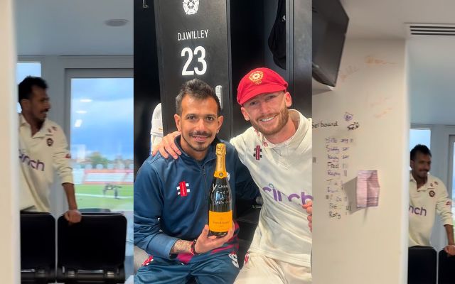 Yuzvendra Chahal काउंटी क्रिकेट में धाकड़ प्रदर्शन कर रहे हैं, पहले उन्होंने सफेद गेंद से कमाल किया और फिर लाल गेंद से खुद को साबित कर दिखाया। ऐसे में चहल की खुशी इन दिनों अलग लेवल पर नजर आ रही है, साथ ही चहल की टीम County Championship Division Two में मुकाबला भी जीत गई है। जिसके बाद ये स्पिनर खुशी के मारे आउट ऑफ कंट्रोल हो गया है और ड्रेसिंग रूम में जमकर जश्न मनाने लगा।