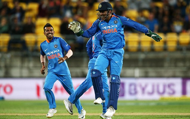 WELLINGTON, NEW ZEALAND – FEBRUARY 03: MS Dhoni of India celebrates after taking the wicket of Jimmy Neesham of New Zealand during game five in the One Day International series between New Zealand and India at Westpac Stadium on February 03, 2019 in Wellington, New Zealand. (Photo by Hagen Hopkins/Getty Images)