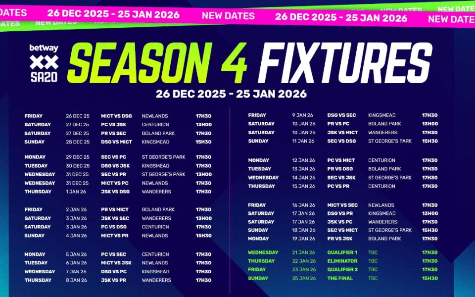 “Announcing the fixtures is always a major milestone for us and signals that we are well on our way to another incredible season. Season 4 of the SA20 will be unique. We have carefully planned the fixtures to make the most of the festive season and school holidays. We want SA20 to be a part of the holiday season festivities in our once-off window for this year. We’re also excited to host New Year’s Eve and New Year’s Day fixtures for the first time, we can’t wait to be a part of the New Year’s celebrations with the fans,” *League Commissioner, Graeme Smith said*.